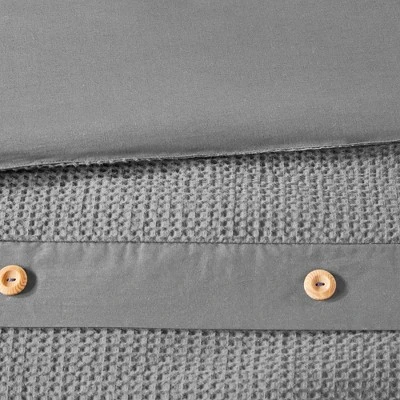 Give your bedroom a simple and clean allure with the Lucina 3pc Cotton Waffle Weave Duvet Cover Set. The 100% cotton duvet cover and shams feature a waffle weave that provides a soft textured look and feel. The button closures allow you to place a comforter insert within the duvet cover and the internal corner ties prevent it from shifting. Decorative wood button details also adorn the face of the duvet cover and shams for a charming and functional accent. With a fresh contemporary style, this cotton duvet cover set is machine washable and pairs perfectly with any bedroom décor.