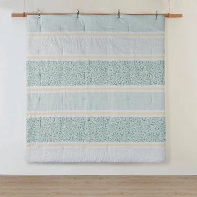 Featuring three different floral and botanical print designs separated by lace trims, this Madison Park seersucker microfiber comforter set exudes shabby chic/farmhouse style that adds a touch of elegance to any bedroom. The two decorative pillows feature gathered fabric and embroidery with lace trim and ruffles, adding to the overall charm of the set. Colors featured in this set include various shade of greens, yellows, and whites.
