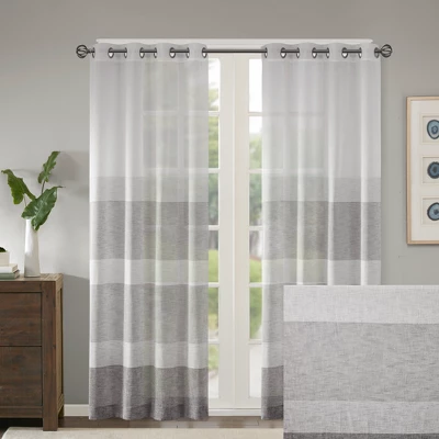 Modern stripes at its best, our Jacey Woven Striped Window Sheer is the perfect addition for a relaxed space. Neutral colored stripes are printed at the bottom for a unique border design, while the faux linen sheer fabric provides an organic texture for a cool and casual update. Silver grommet top makes this panel easy to hang, open, and close throughout the day; fits up to 1.25″ diameter rod.