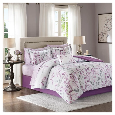 The Madison Park Essentials Lafael Complete Comforter and Cotton Sheet Set offers a charming update for your bedroom. The grey comforter showcases purple and dark grey leaves with a solid purple reverse, for a vivid floral look. Matching shams (1 for Twin Sizes) and an embroidered decorative pillow accentuate the floral motif. Also included is a purple cotton sheet set with an ogee print that harmonizes with the comforter set. Bringing the best in health and wellness, this bedding set also features an anti-microbial treatment that provides built-in freshness protection, reducing the growth of odor causing bacteria and keeps fabric lasting longer. This bedding set is also OEKO-TEX certified, meaning it does not contain any harmful substances or chemicals, ensuring quality comfort and wellness. This bedding set may come in rolled or compressed packing and will need to be fluffed up. Use a steam iron to help remove wrinkles easier.