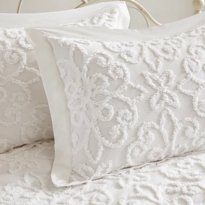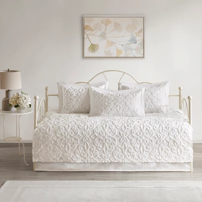 Give your guest bedroom a soft and cozy look with the 5pc Amber Tufted Cotton Chenille Daybed Set. This daybed cover features a classic medallion design that adds dimension and charm to the top of the bed. Three matching shams repeat the pattern seen on top of the bed to create a beautiful coordinated look, while the bed skirt provides an elegant finishing touch. Made from cotton chenille, this cottage-inspired daybed cover set is machine washable to make cleaning a breeze.